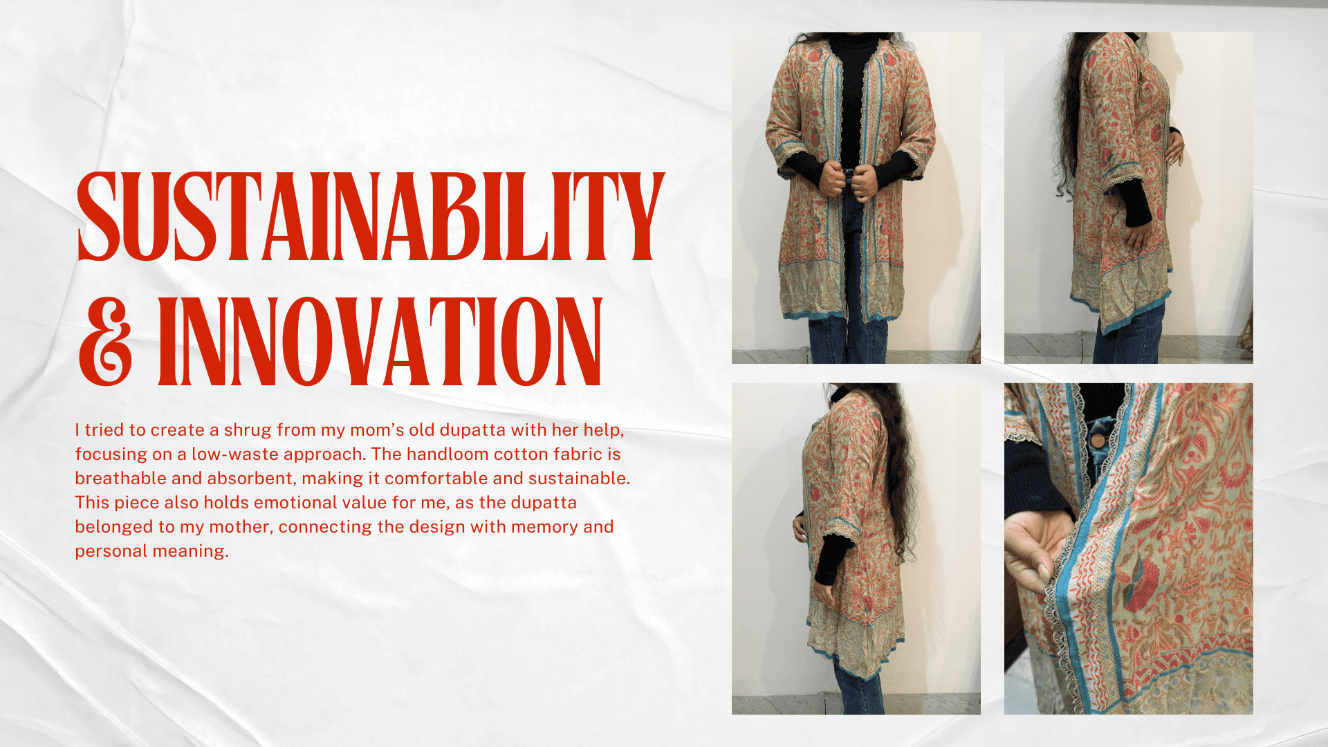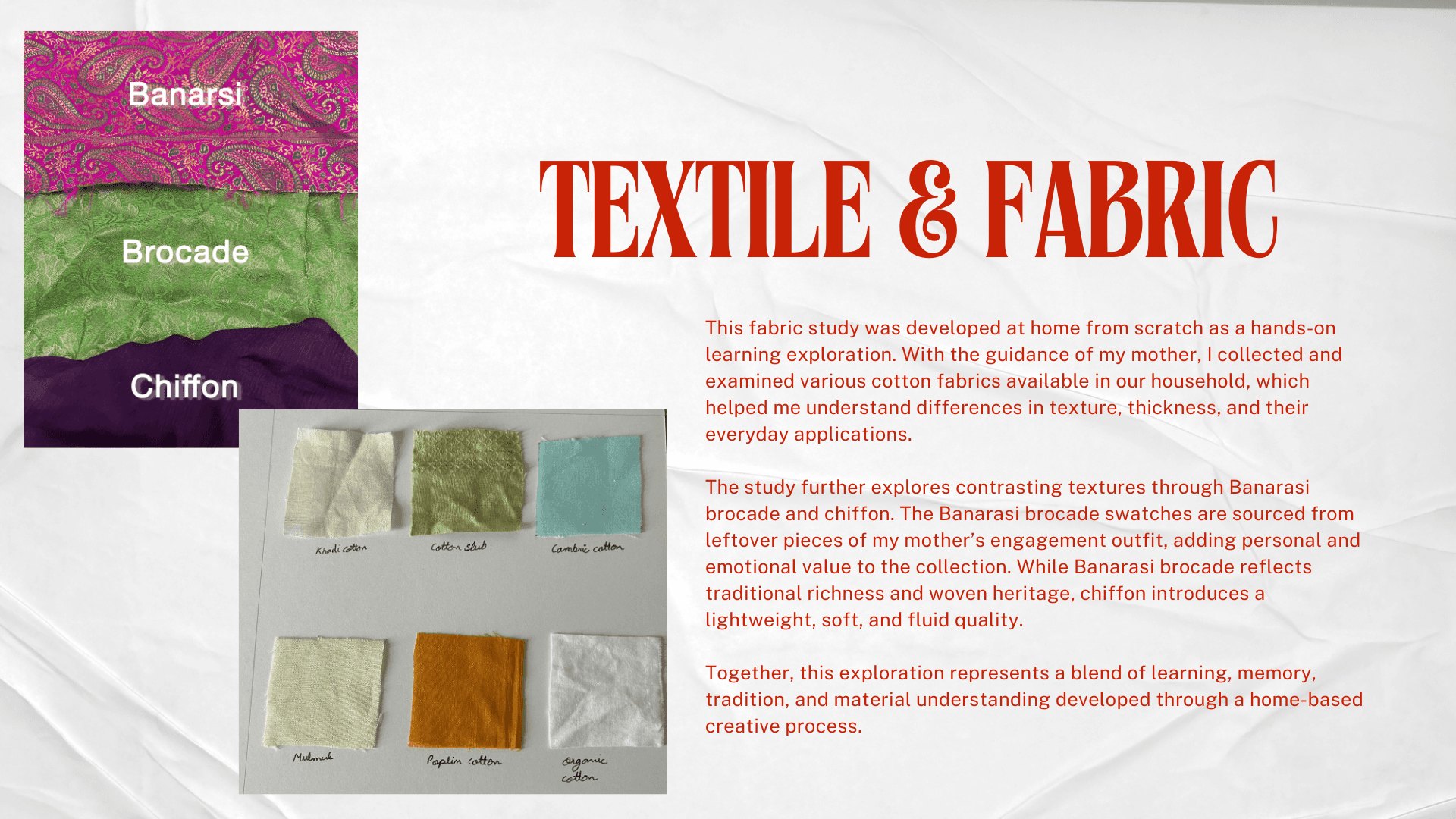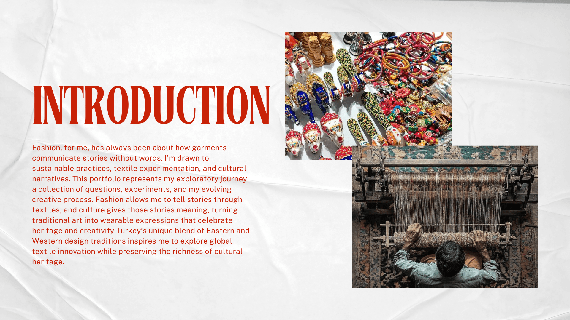 Fashion, for me, has always been about how garments communicate stories without words. I'm drawn to sustainable practices, textile experimentation, and cultural narratives. This portfolio represents my exploratory journey—a collection of questions, experiments, and my evolving creative process.