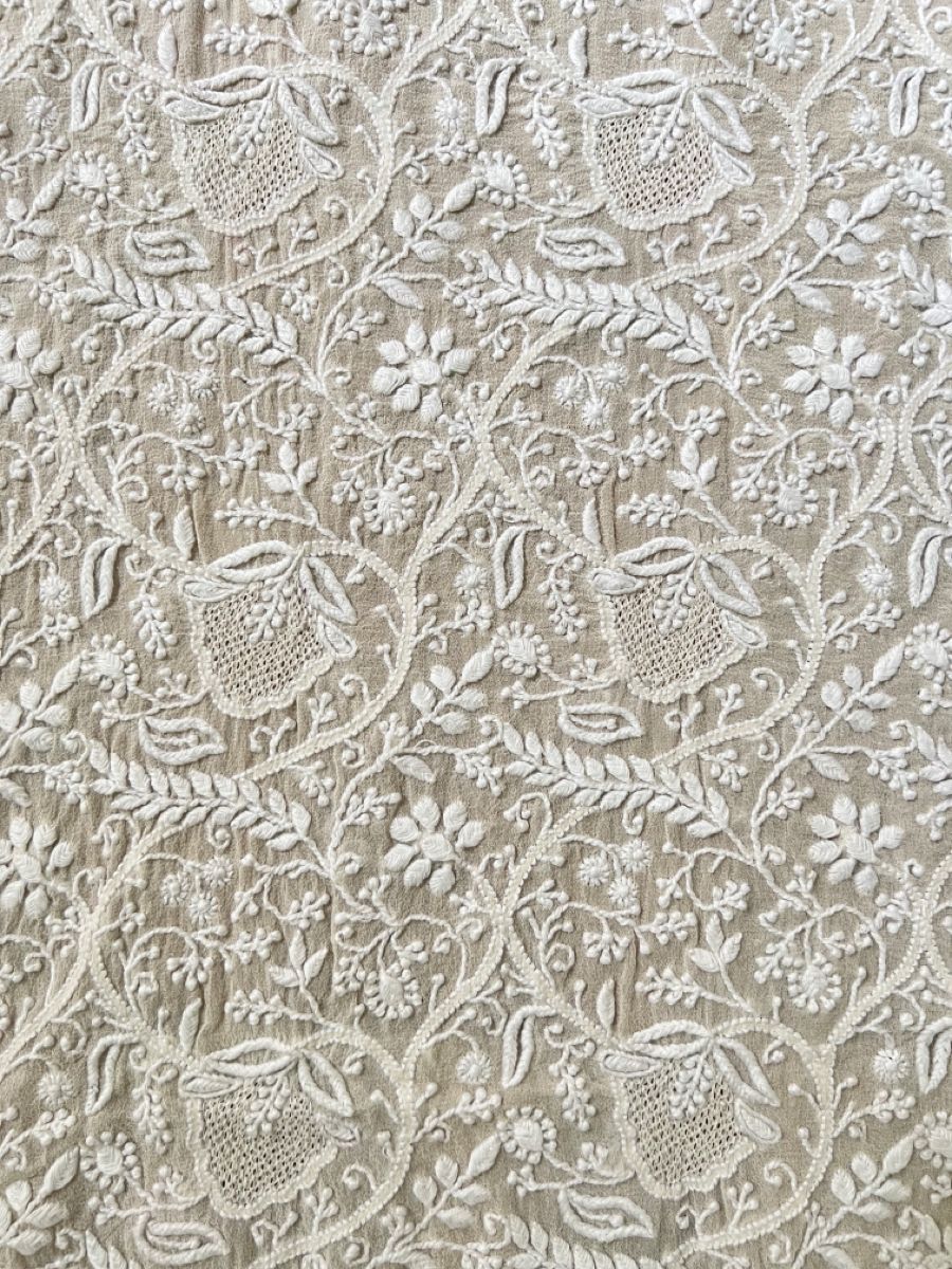 Chikankari embroidery, originating from Lucknow, challenges the common belief that art must rely on vibrant color to be beautiful. In a world that often equates richness with brightness, Chikankari stands quietly apart. Its white-on-white composition proves that elegance does not demand excess—it thrives in restraint.